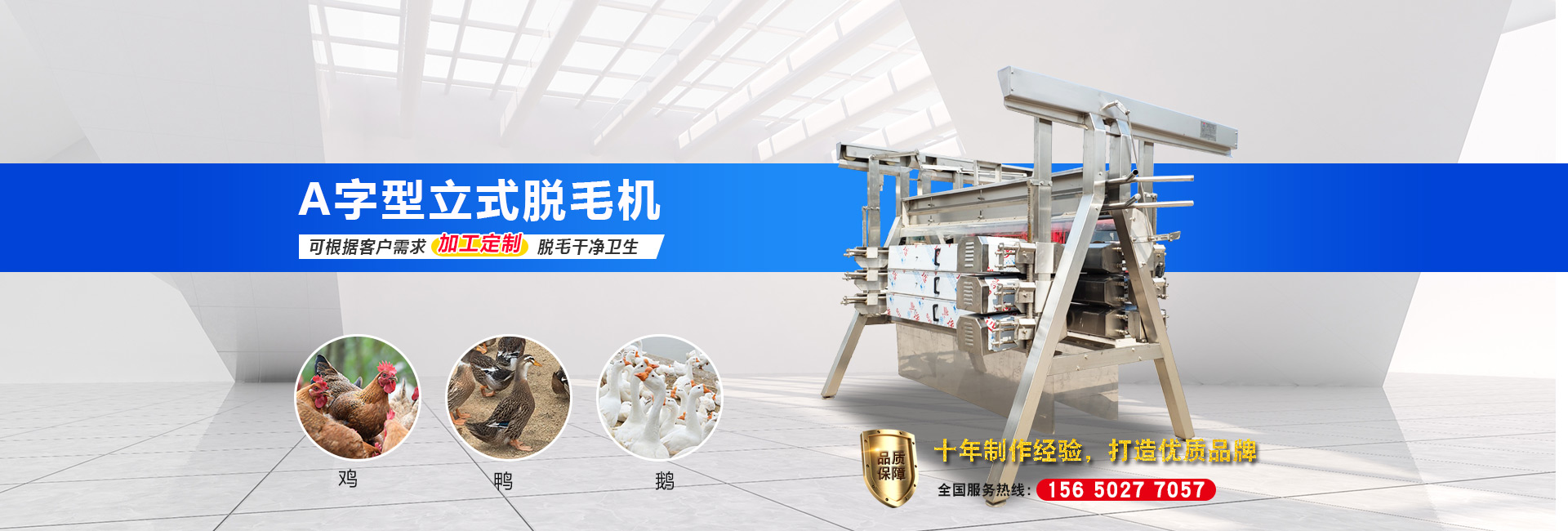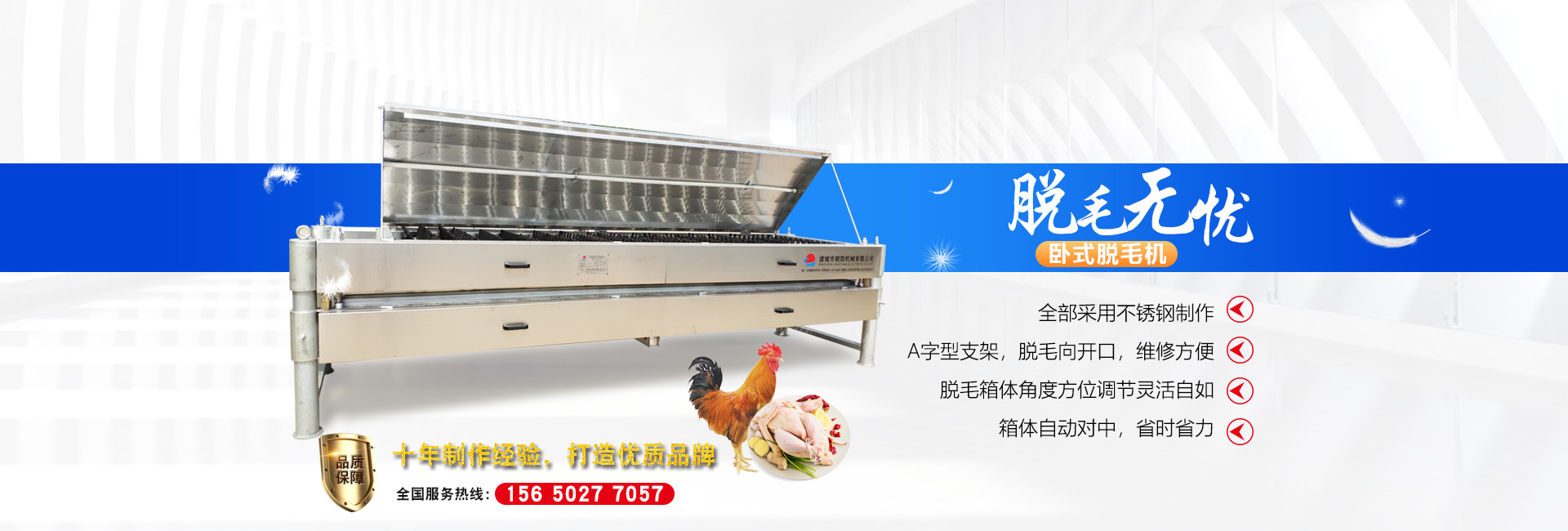 公司長(zhǎng)期與國(guó)內(nèi)外屠宰加工企業(yè)合作,走引進(jìn)——消化——?jiǎng)?chuàng)新和自主研發(fā)相結(jié)合的道路,在國(guó)內(nèi)外同類產(chǎn)品的基礎(chǔ)上,不斷更新和改造。公司主要設(shè)備有:A字型立式脫毛機(jī)、臥式脫毛機(jī)、強(qiáng)力噴淋機(jī)、松毛機(jī)、浸燙池、螺旋預(yù)冷機(jī)、禽籠清洗機(jī)、電暈機(jī)、兔扯皮機(jī)、兔割前爪/后爪機(jī)、剝胗機(jī)、自動(dòng)洗鉤機(jī)、螺旋燙爪機(jī)、雞爪脫皮機(jī)、分割輸送帶等屠宰用設(shè)備。其中,公司獨(dú)力發(fā)明生產(chǎn)設(shè)計(jì)的“電動(dòng)調(diào)節(jié)脫毛機(jī)”及“自動(dòng)控水控溫浸燙池”順利通過(guò)知識(shí)產(chǎn)權(quán)局的實(shí)質(zhì)性審查。公司所生產(chǎn)的設(shè)備 可與國(guó)外同類產(chǎn)品配套使用,設(shè)備遠(yuǎn)銷阿爾及利亞、澳大利亞等中東、非州等并建立了長(zhǎng)期穩(wěn)定的合作關(guān)系。